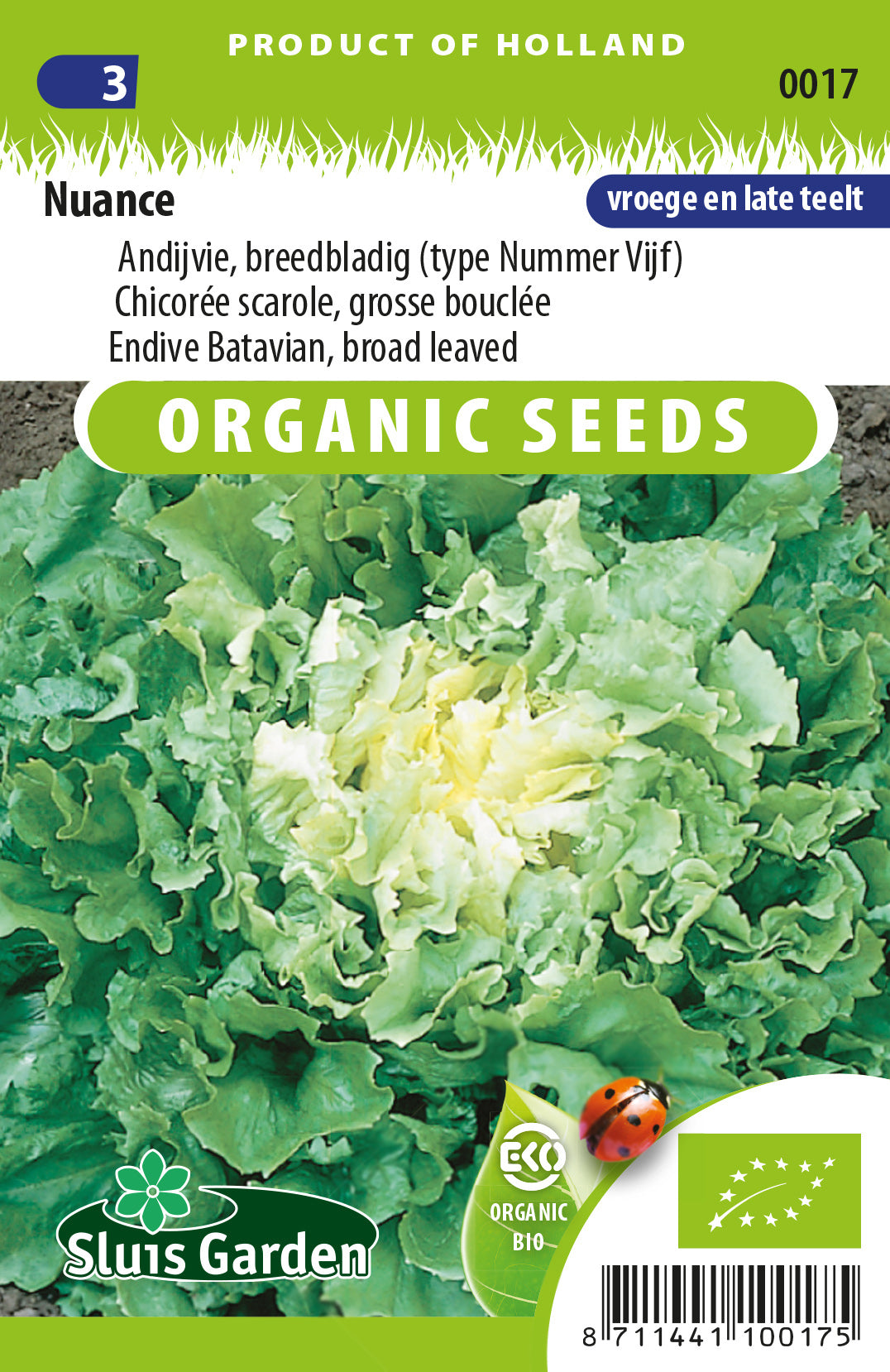 Biologische andijvie Nuance is een zelfstandig ras van type nummer vijf en staat bekend om zijn gelijkmatige groei en hoge kwaliteit. De zaden zijn biologisch geteeld, geschoond en verpakt volgens de officiële biologische productiemethode. De teelt en verwerking worden gecontroleerd door Stichting SKAL (NL-BIO-01).